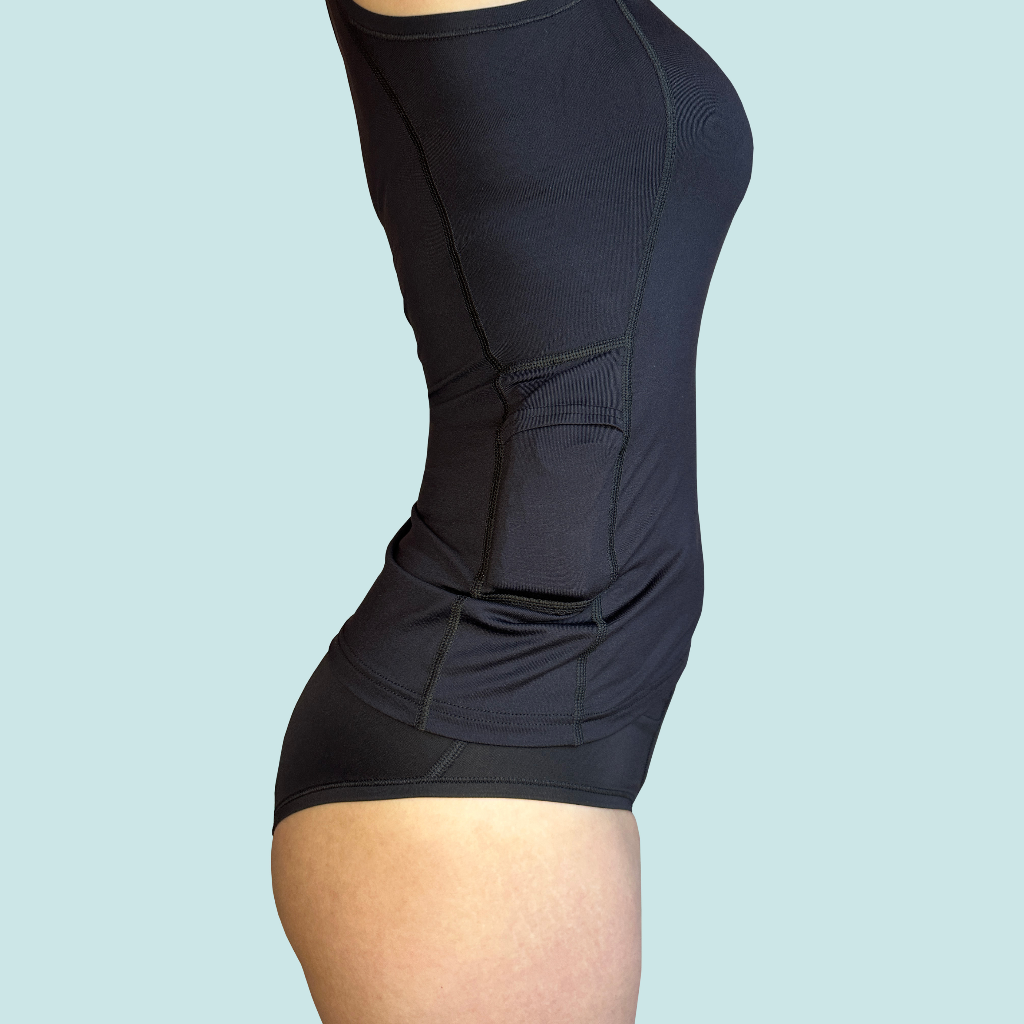 Drei geschickt platzierte Taschen für eine komfortable Positionierung der Insulinpumpe: Zwei Taschen mit kleiner Öffnung für diskret verlaufende Infusionsschläuche. Eine dritte, versteckte Tasche in der Achsel mit Trichterform für flexible Pumpenpositionierung.